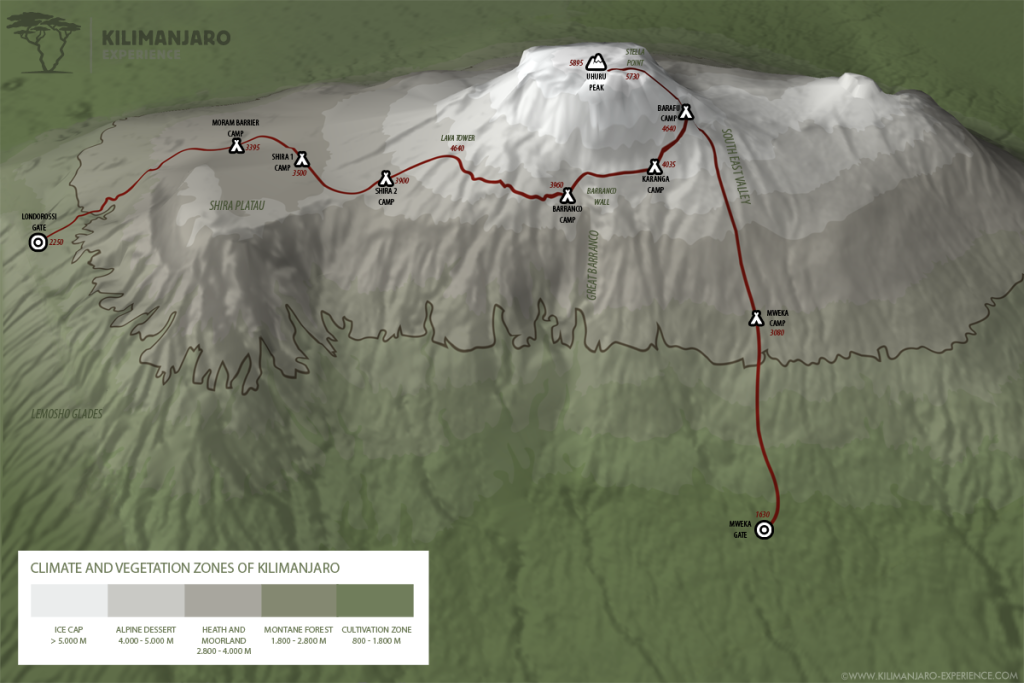 - Starting Point: Shira Gate at 11,500 ft (3,500 m). Unlike other routes, climbers are driven past the rainforest zone, beginning directly on the Shira Plateau.